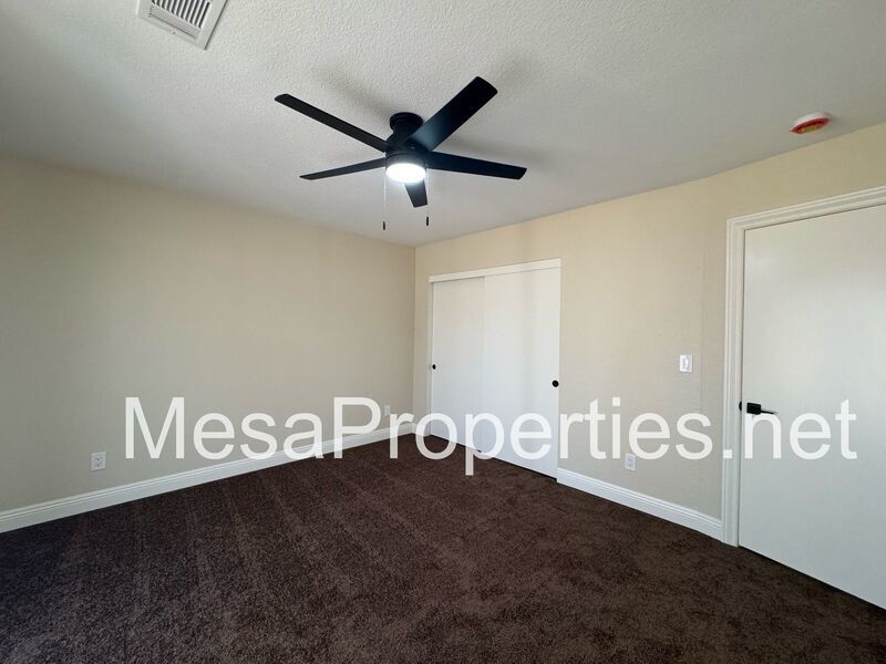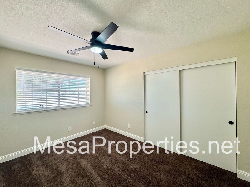 The master bedroom includes a sliding glass door that leads to a covered patio, ideal for relaxing outdoors. All bedrooms are comfortably sized and include closets and brand-new ceiling fans for added comfort. The hallway offers generous storage space as well.