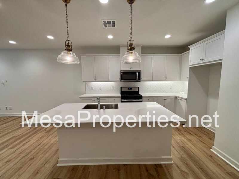 Step inside to a spacious living room that opens seamlessly into the dining area and kitchen, complete with a large island and abundant cabinet space. A convenient half bath on the main level makes entertaining easy. Upstairs, carpet flooring leads to three roomy bedrooms. Two guest bedrooms offer generous closet space with a full bathroom in the hall. The primary suite includes a private bathroom with dual sinks, a separate tub and shower, a walk-in closet, and its own private balcony overlooking the grassy greenbelt.