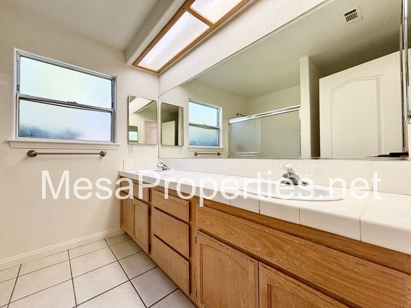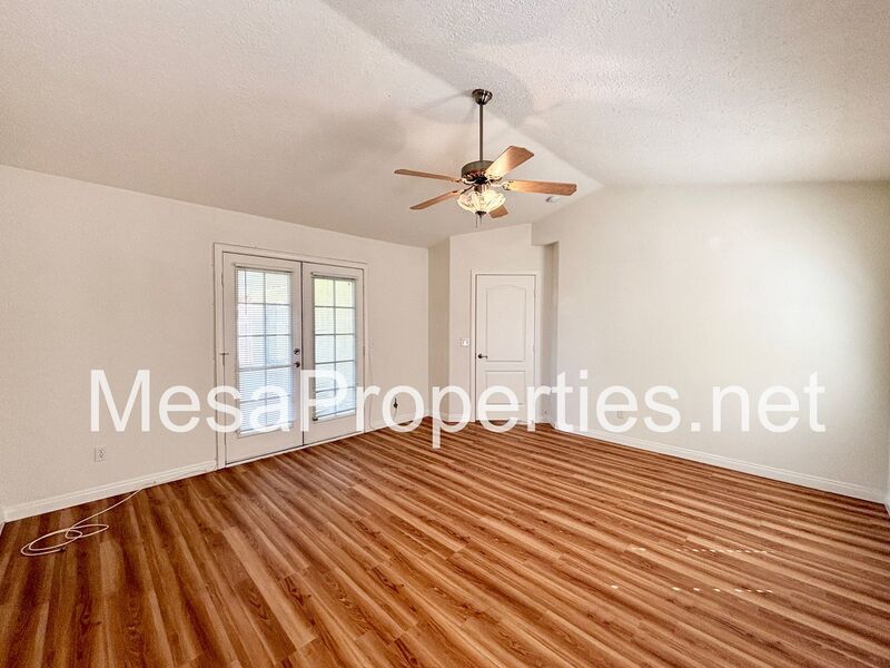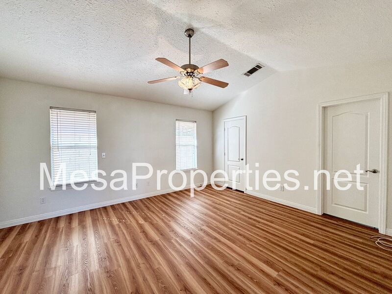 All three bedrooms are bright and airy, complete with ceiling fans and deep closets. The master suite is a true retreat, offering high ceilings, a walk-in closet, double doors to the backyard patio, and a master bathroom with a double vanity and a large shower.