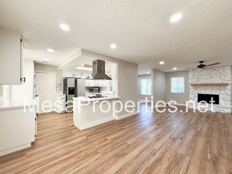 Inside, enjoy new flooring, fresh paint, updated countertops, modern lighting, and blinds throughout. The open living and dining area features a cozy fireplace and easy access to the backyard, perfect for entertaining. The kitchen comes fully equipped with a range, dishwasher, refrigerator, and microwave.